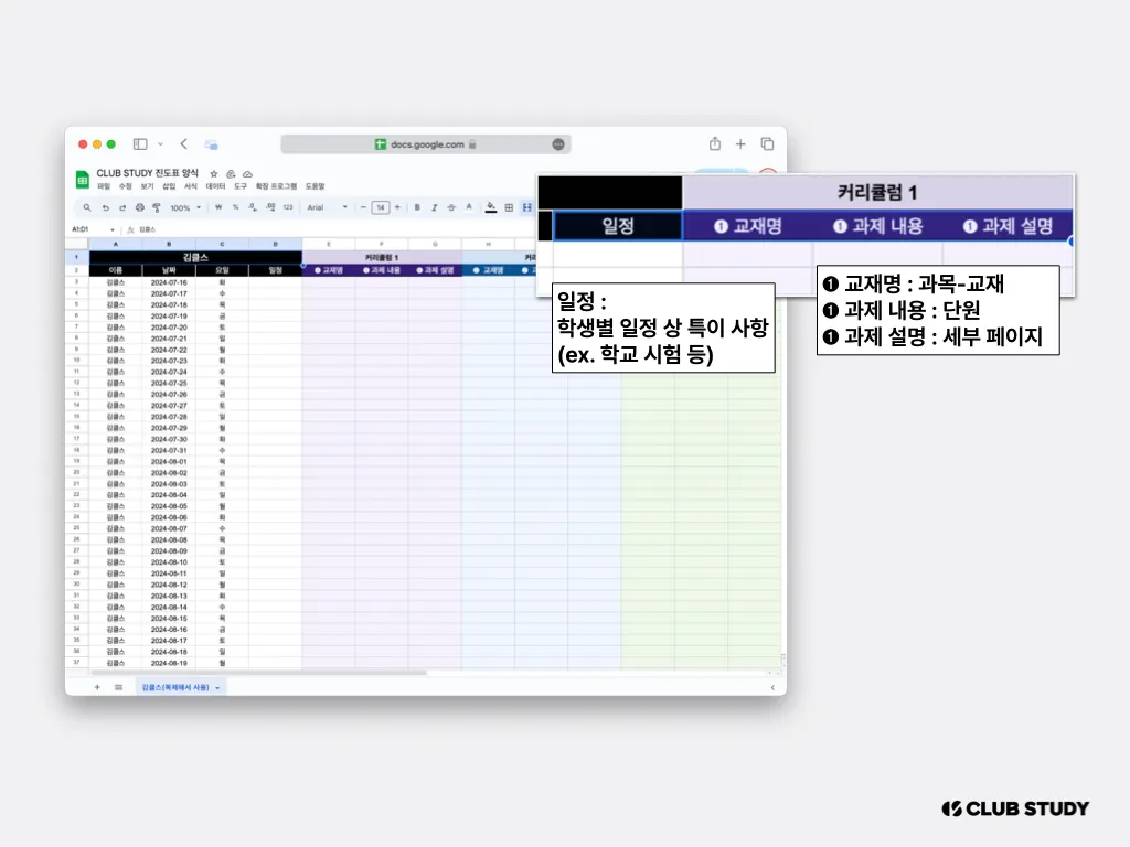 과목-교재 별로 한 커리큘럼에 날짜별 학습 내용을 작성해주시면 됩니다.