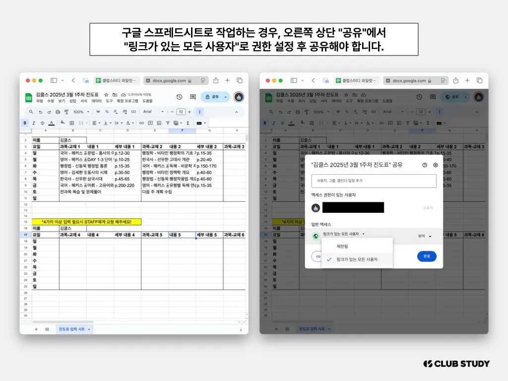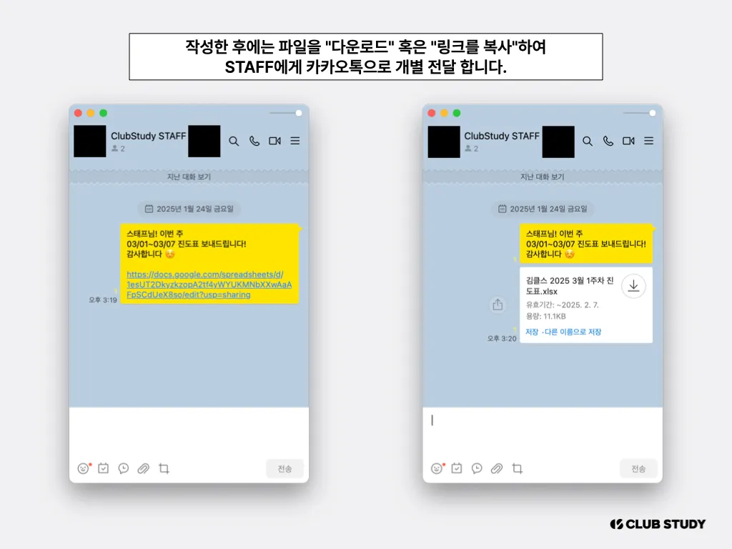 진도표 제출은 “엑셀 파일” 혹은 “구글 스프레드시트 링크 공유”로 제출할 수 있어요.