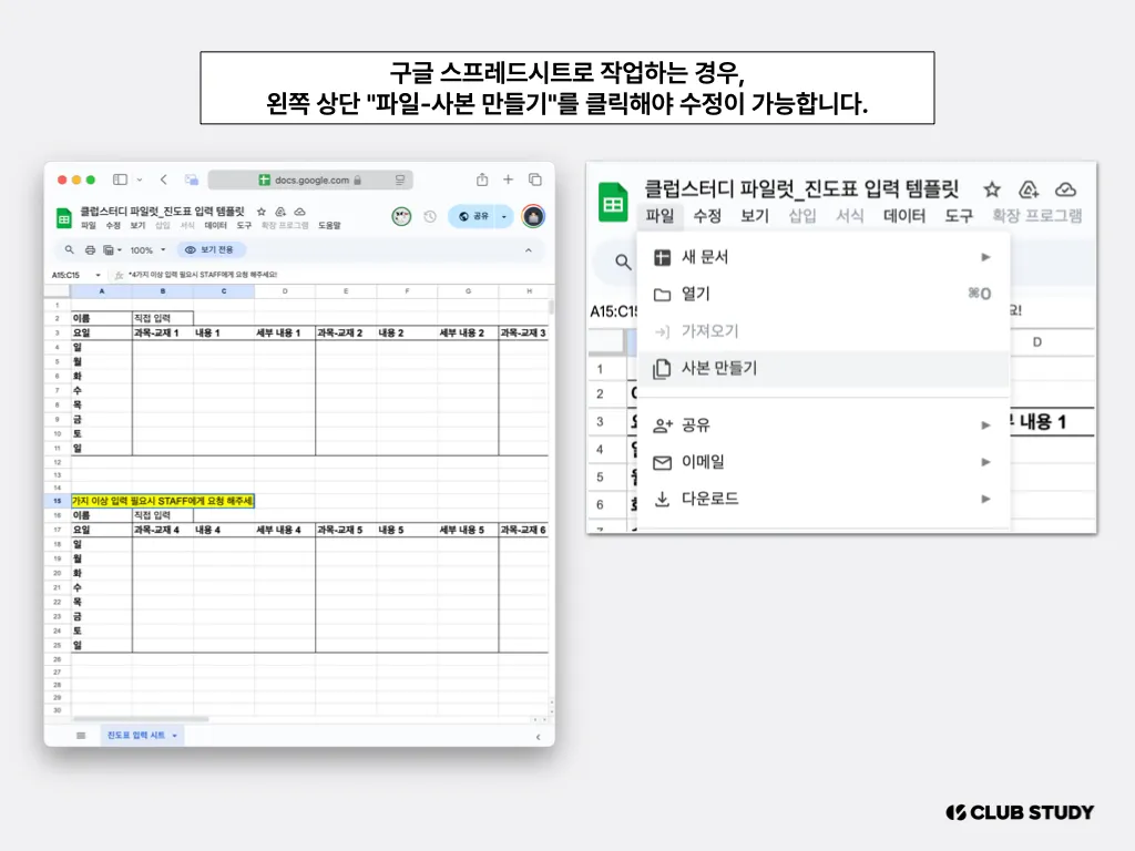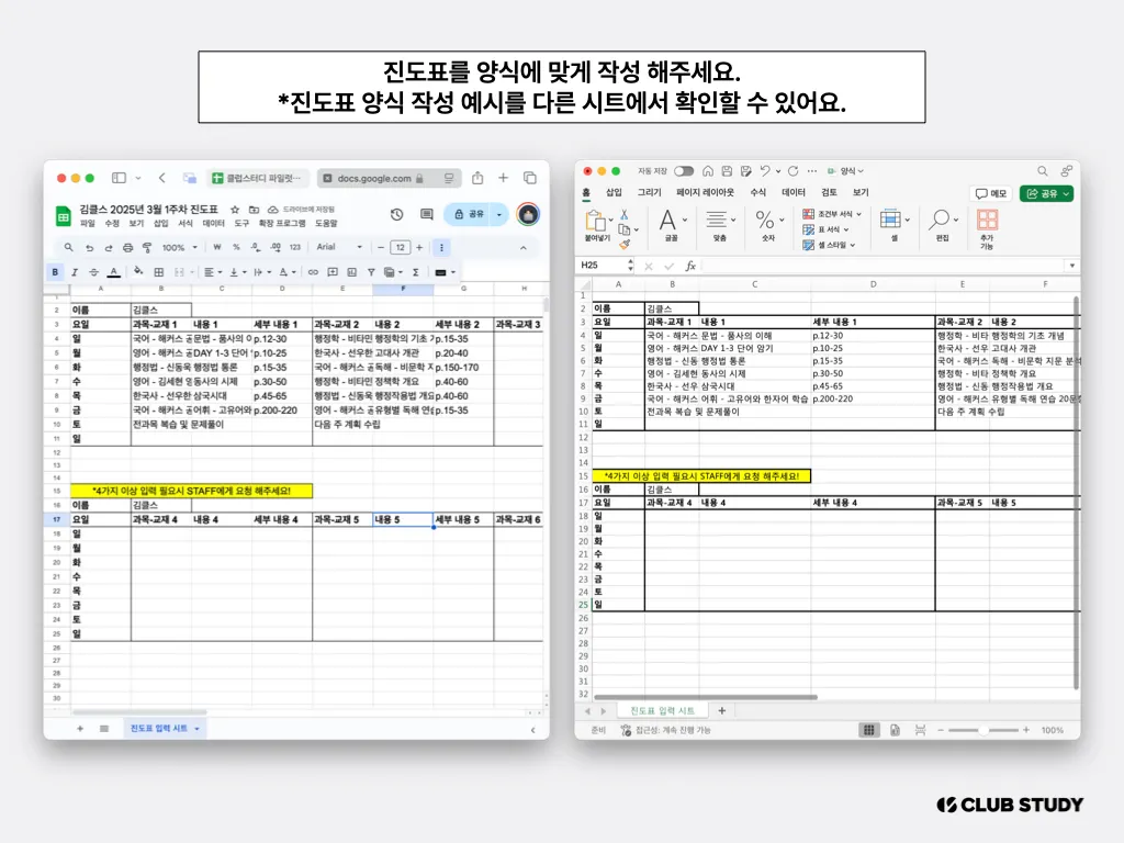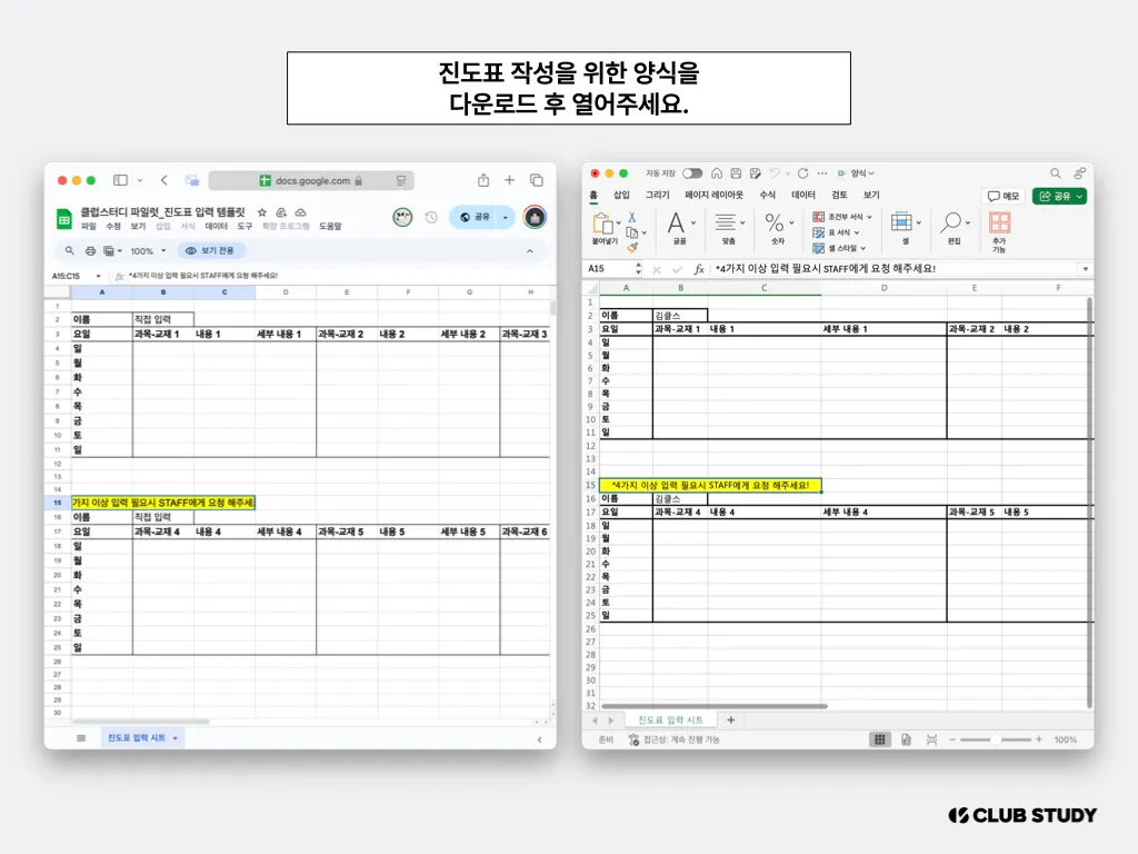 파일 다운로드 후, 양식에 맞춰 진도표를 작성해요.