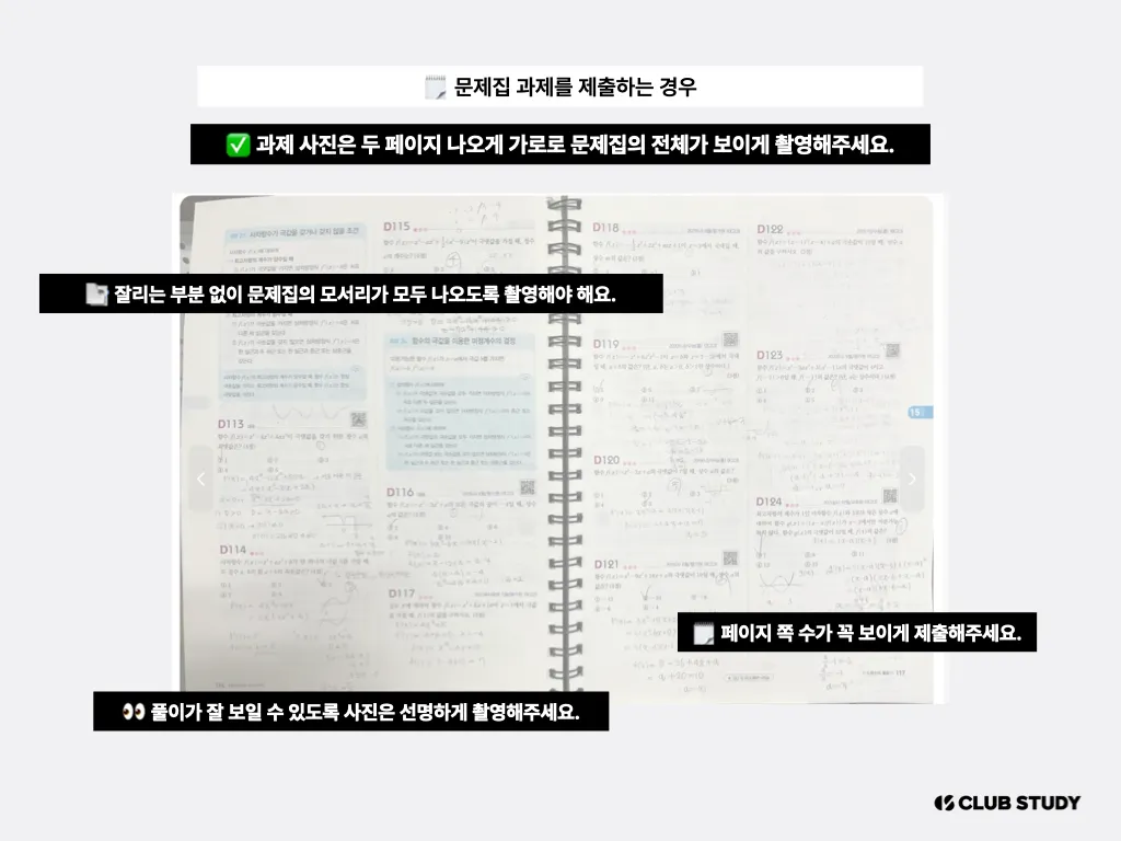 과제 사진은 두 페이지가 나오게, 가로로 문제집의 전체가 보이게 촬영해주세요.