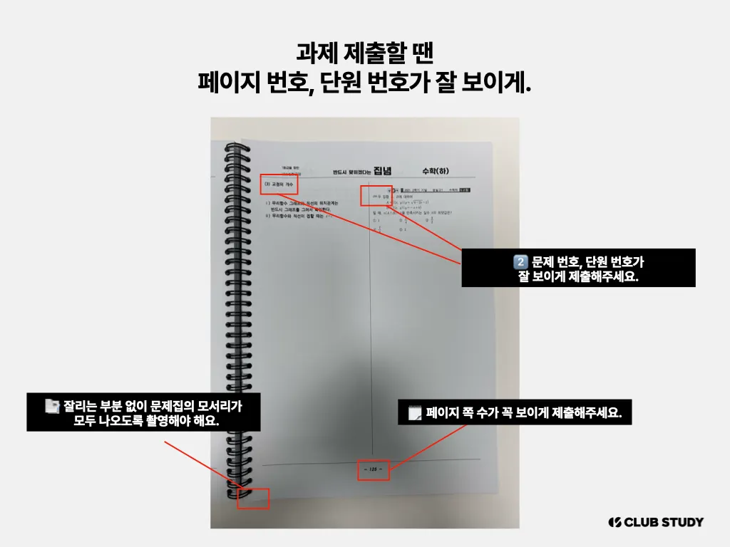 과제 사진은 두 페이지가 나오게, 가로로 문제집의 전체가 보이게 촬영해주세요.