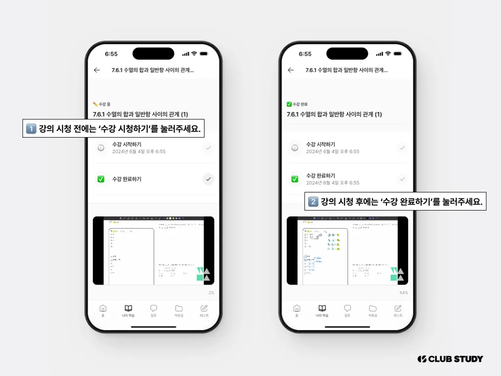 강의 시청 전에는 ‘수강 시청하기’, 강의 시청 후에는 ‘수강 완료하기’ 버튼을 눌러주세요.
