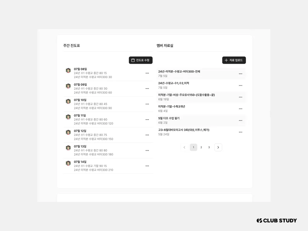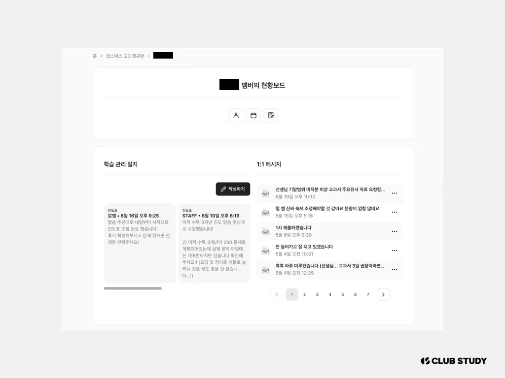 멤버 진도표, 학습 관리 일지, 1:1 메시지, 진도표 등