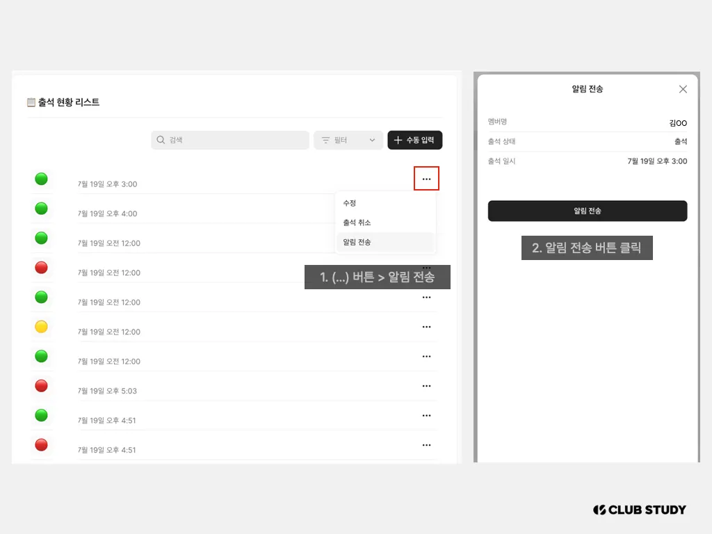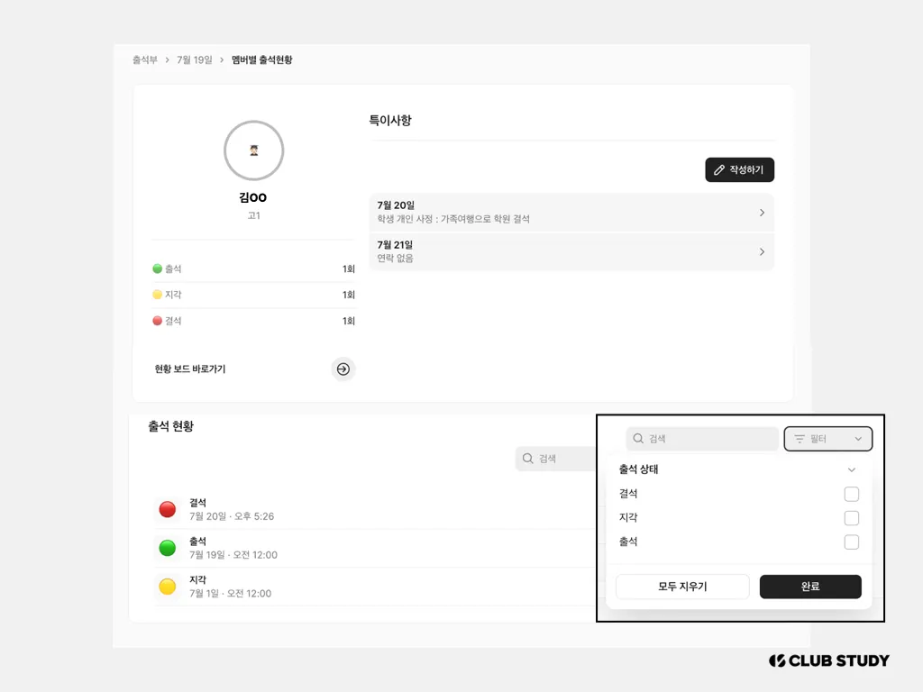여기서 멤버의 전체 출석 수, 지각 수, 결석 수와 작성된 특이사항을 확인할 수 있어요.