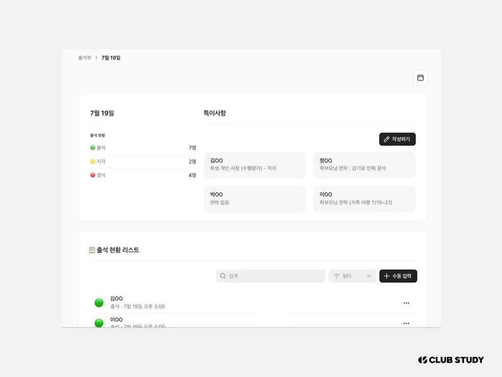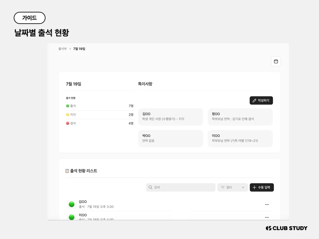선택한 날짜의 전체 출석, 지각, 결석 수와 함께 특이사항을 볼 수 있어요.