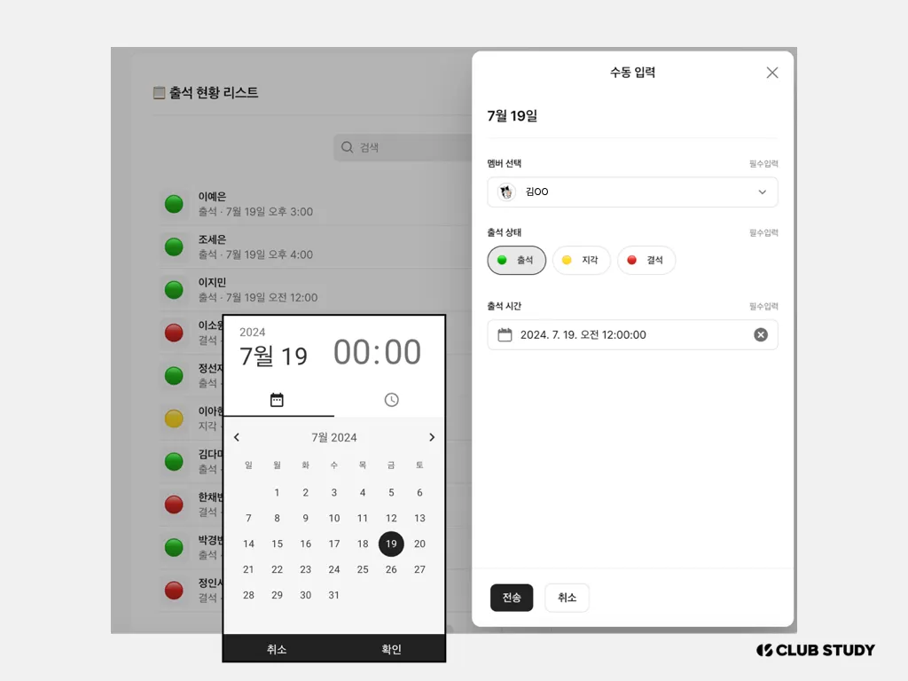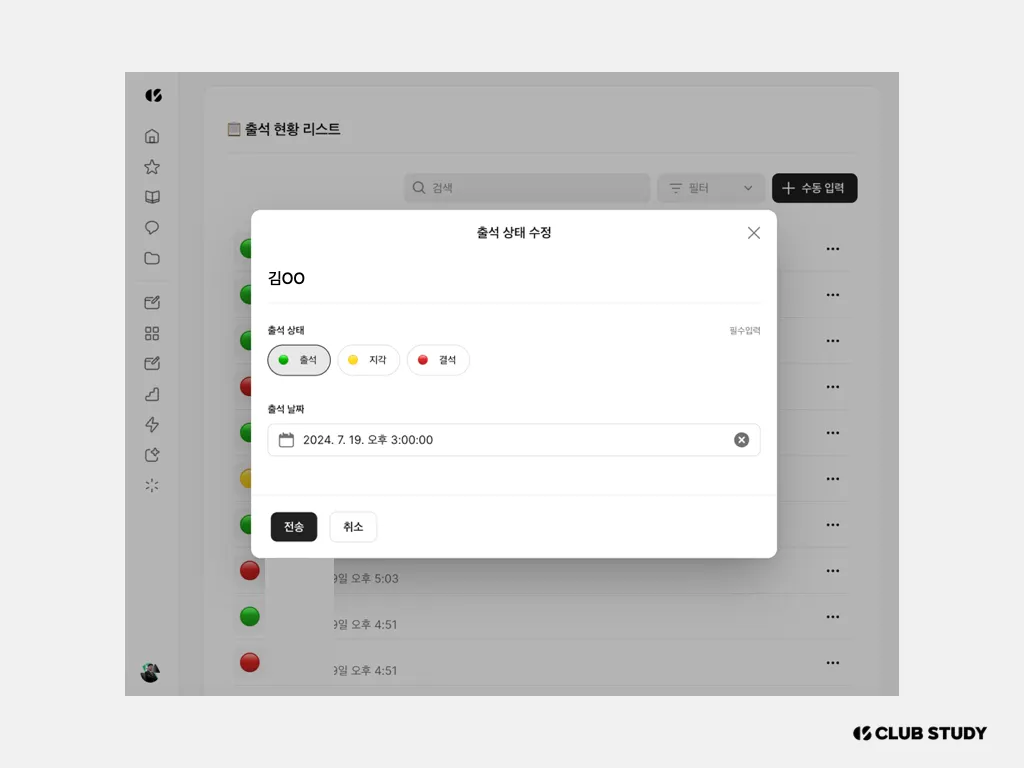 출석 상태를 수정하거나 시간 수정이 가능해요.