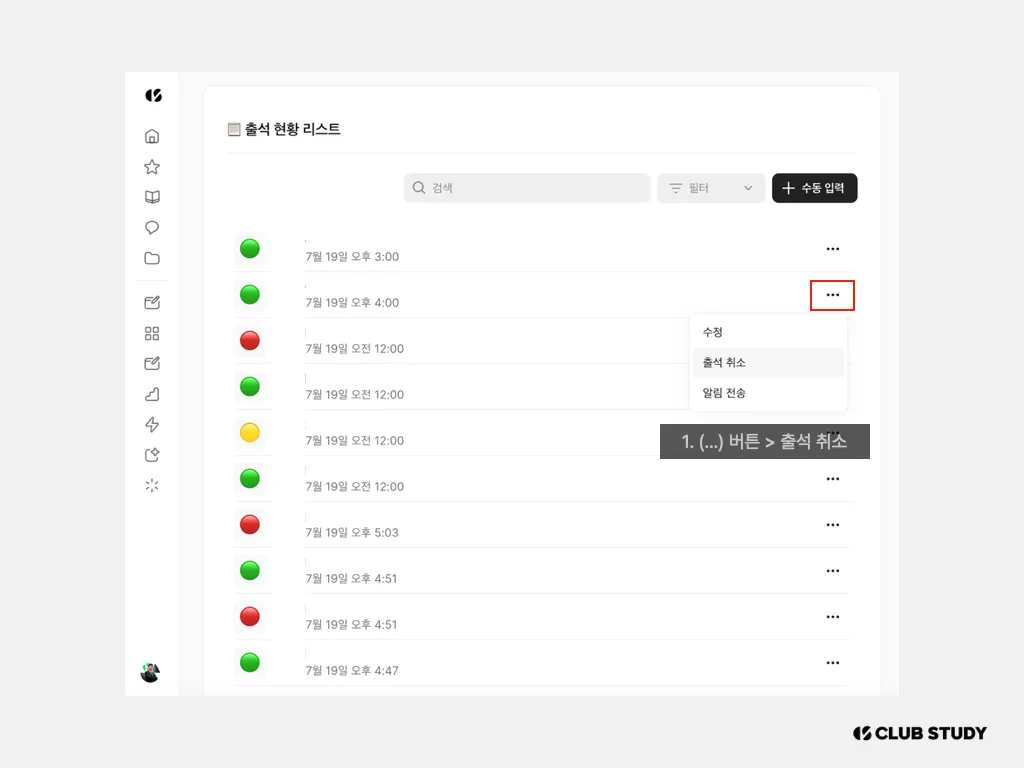 ’수동 입력’ 버튼을 클릭하고, 출석 상태와 관련 정보를 입력해요.