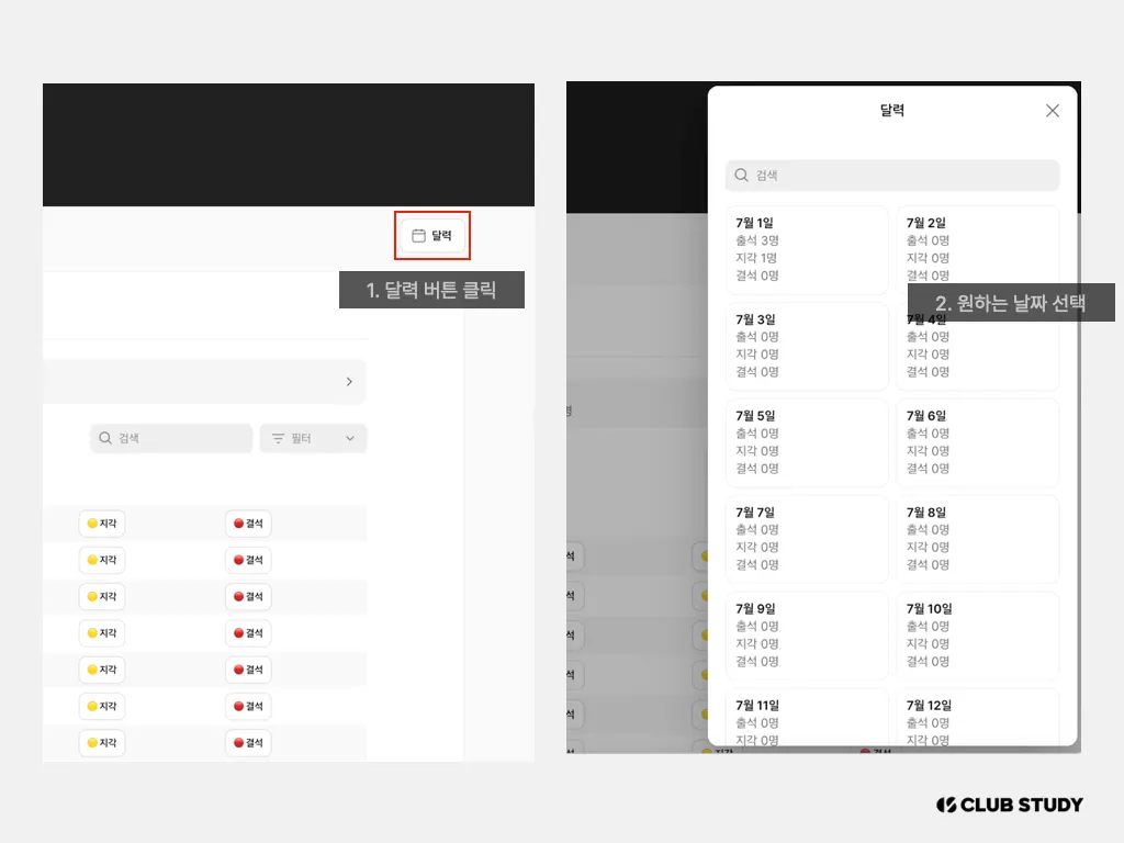 이를 통해 특정 날짜의 출석 상황을 한 눈에 파악이 가능해요.