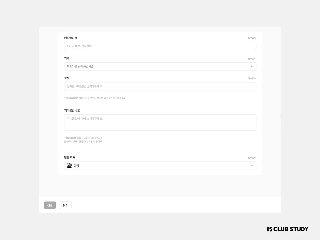 커리큘럼명, 과목, 교재, 커리큘럼 설명을 입력해주세요.