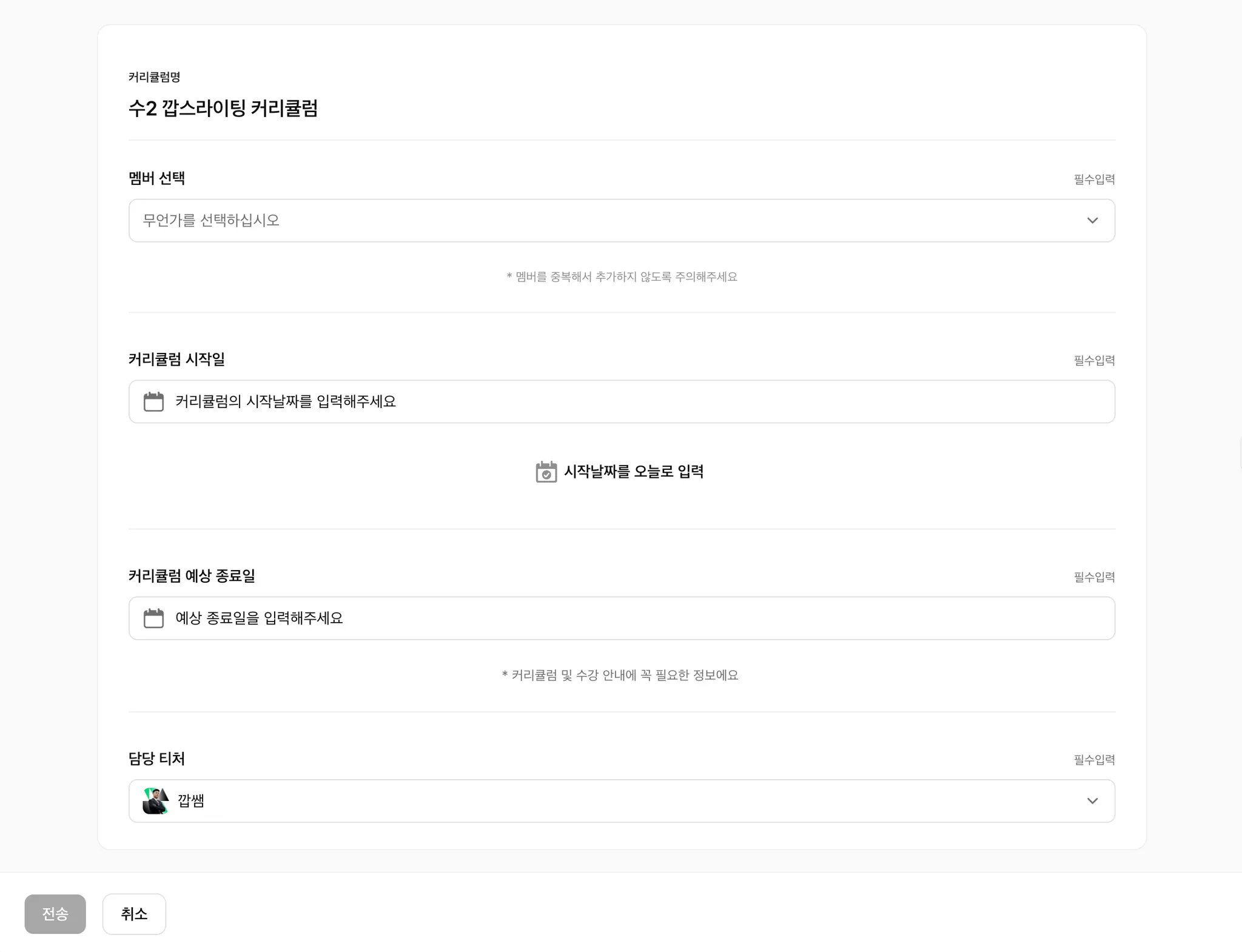 추가할 멤버를 선택하고, 커리큘럼 시작일과 예상 종료일을 입력해주세요.