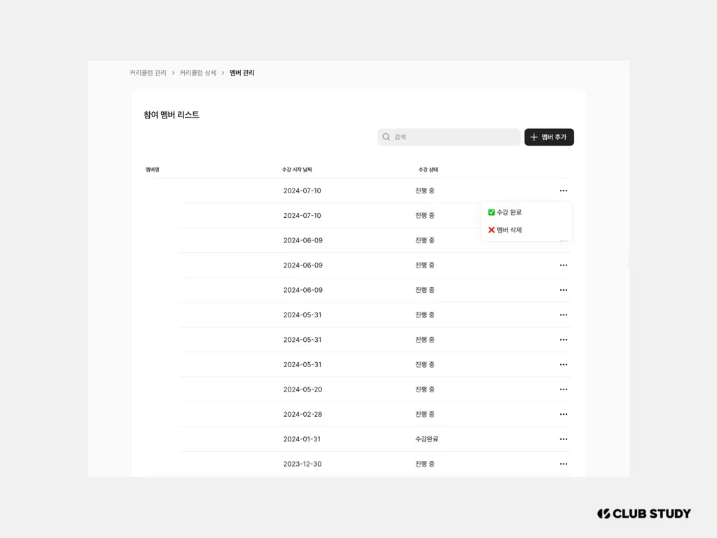 수강 완료 처리와 커리큘럼에서 멤버 삭제가 가능해요.