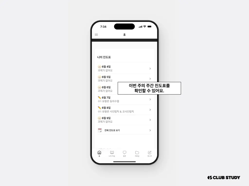 이번 주의 주간 진도표와 과제 완료 현황을 확인할 수 있어요.
