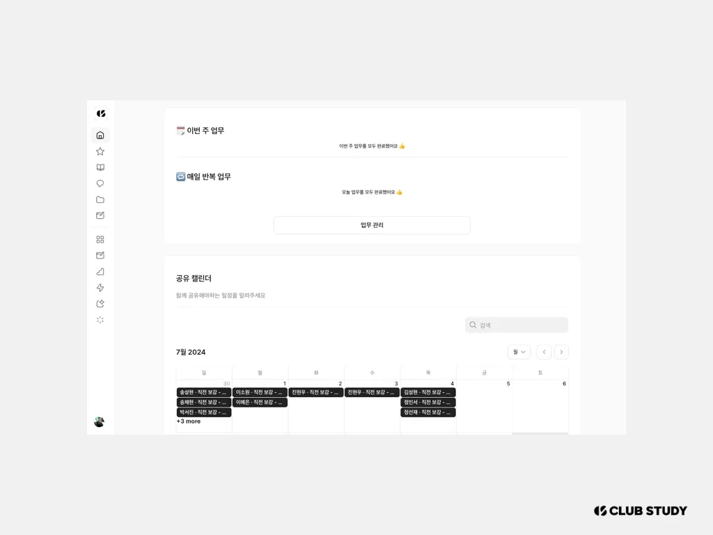 오늘의 업무와 이번 주 업무 리스트, 공유 캘린더까지