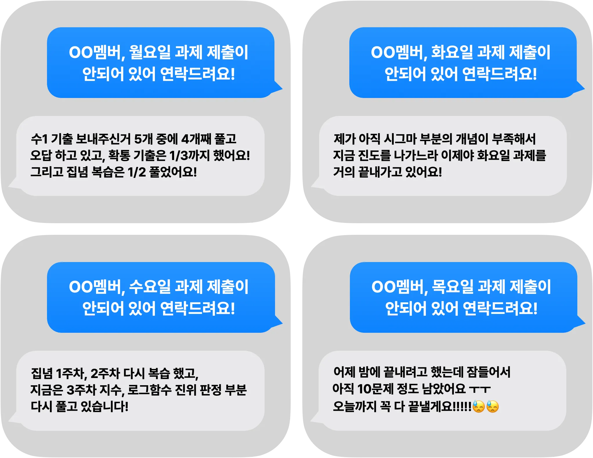 학습 진도표를 기반으로 일정한 학습량을 유지하면서도 자신의 속도에 맞춰 학습할 수 있게 도와 혼자 공부할 때보다 학습량을 늘리며 효율적으로 공부할 수 있다. |
