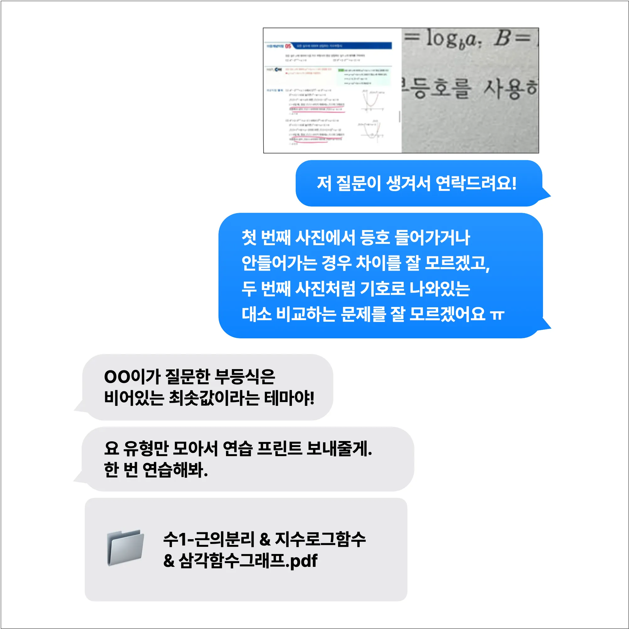 수업 외의 시간에도 상시 질문 제출을 통해 어려운 문항 등에 대해 학생들이 질문하거나 자료 요청 등 추가적인 지도를 받을 수 있음. |