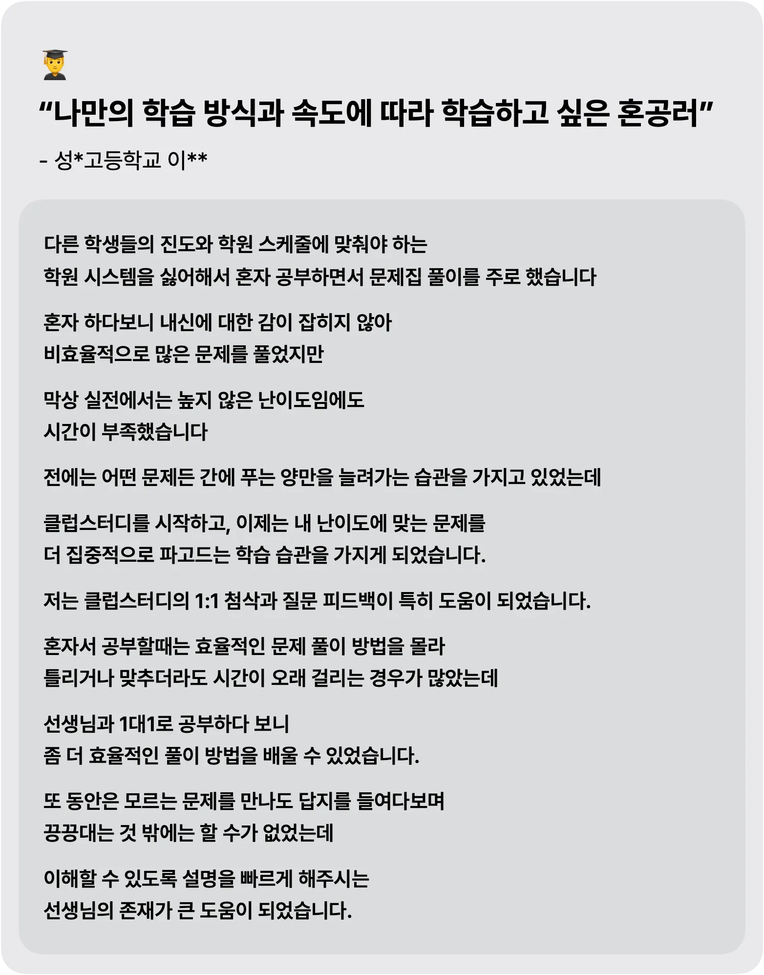 혼자 공부할 때는 찾기 어려운 약점을 파악하고, 이를 효과적으로 채워나갈 수 있다. |